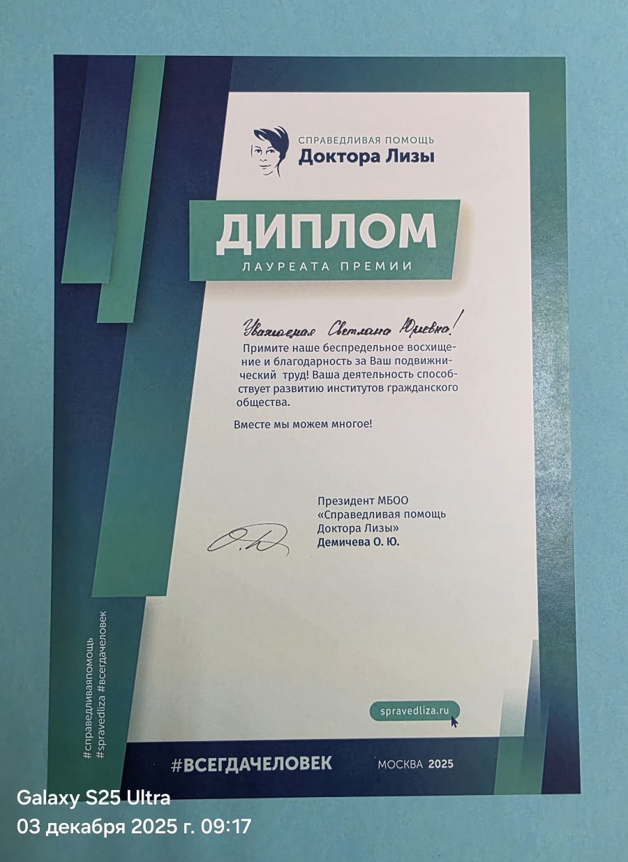 02 декабря 2025 года Международная благотворительная общественная организация «Справедливая помощь Доктора Лизы» совместно с Министерством труда и социальной защиты Российской Федерации, при организационной поддержке Центра социальных проектов «Счастливые люди», провела ежегодную церемонию награждения Премией «Справедливая помощь». На премию приглашены сотрудники ЦСА и ПП, Анохина С.Ю., заведующий отделением, Алексеев С.С., педагог-психолог, которые активно участвовали в мероприятиях, организованных организацией: конференции, вебинары и др., посвящённые вопросам образования, профессиональной ориентации, получения новой профессии и трудоустройства людей в трудной жизненной ситуации. Премия «Справедливая помощь 2025» – итоговое мероприятие цикла мероприятий «#ВСЕГДАЧЕЛОВЕК 2025 года. Премия вручается в разных номинациях. Анохина С.Ю. стала Лауреатом премии в номинации «Преодоление» (Помощь людям с ограниченными возможностями здоровья). Однако за любой наградой стоит коллектив, а это преподаватели, которые отдают свои знания, умения, профессиональные компетенции, опыт для обучения профессии нашим обучающихся с особыми образовательными потребностями. Поздравляем всех педагогов с этой высокой наградой и не останавливаемся на достигнутом!