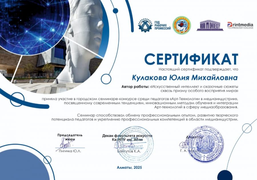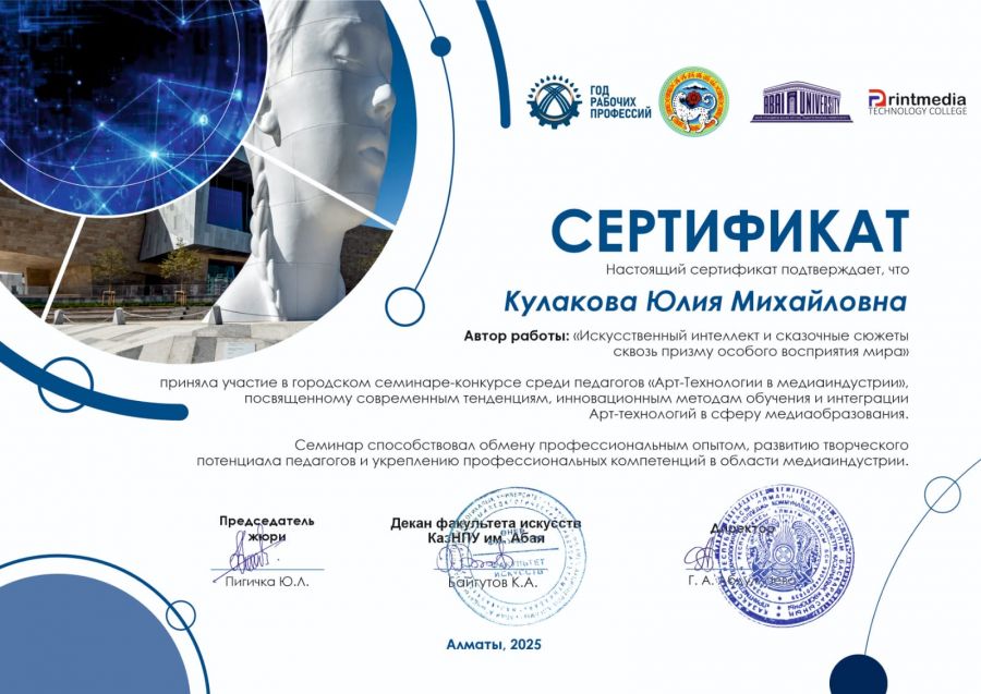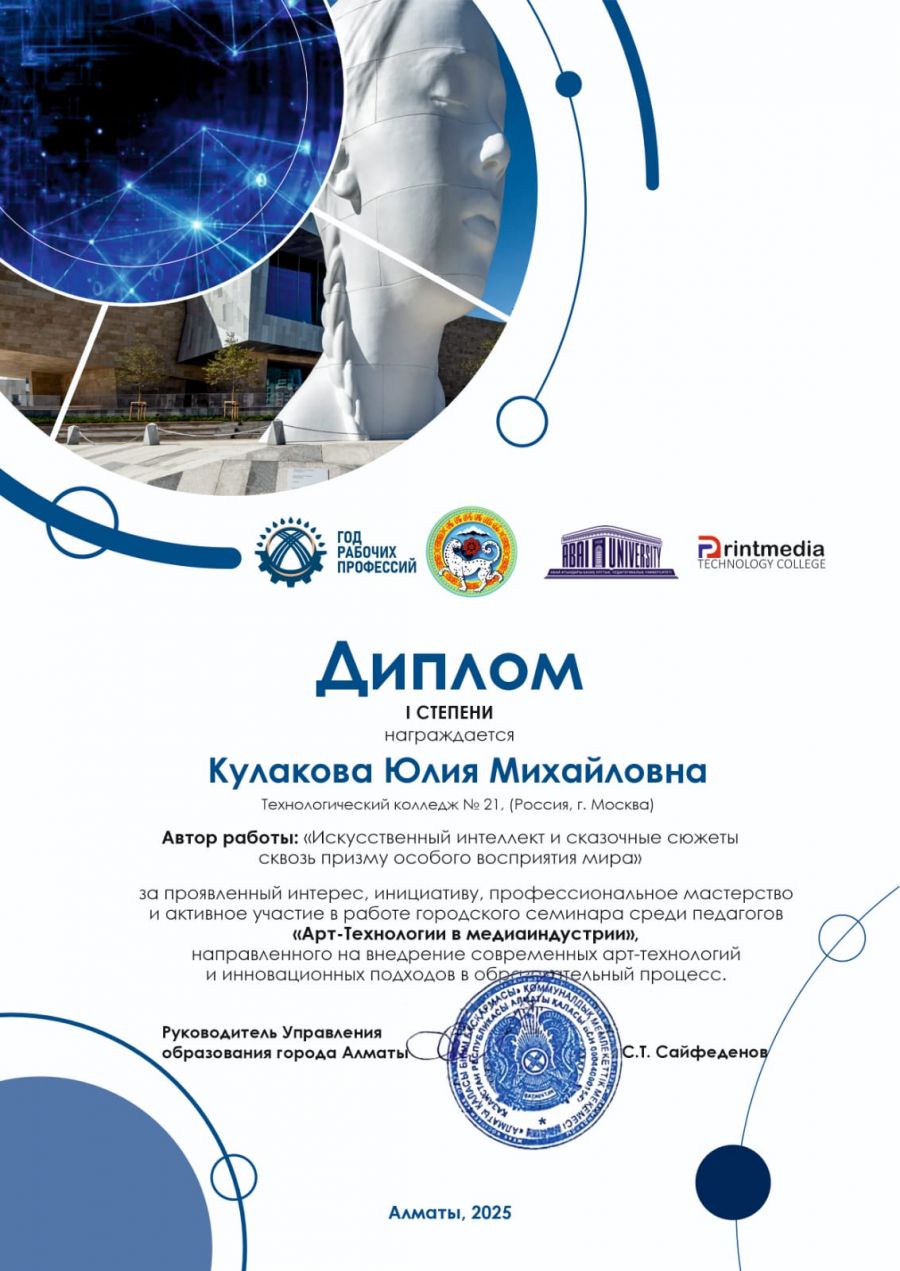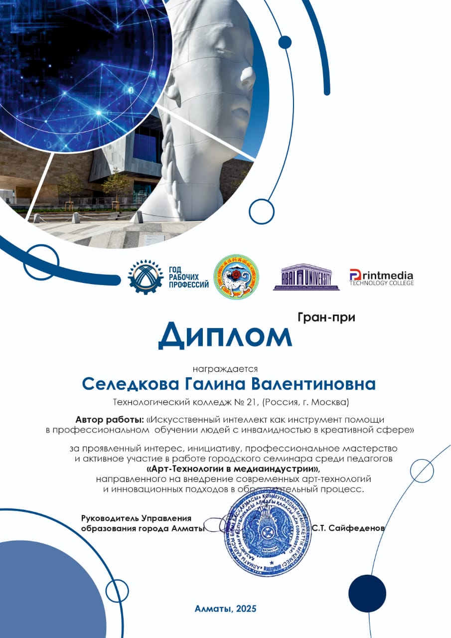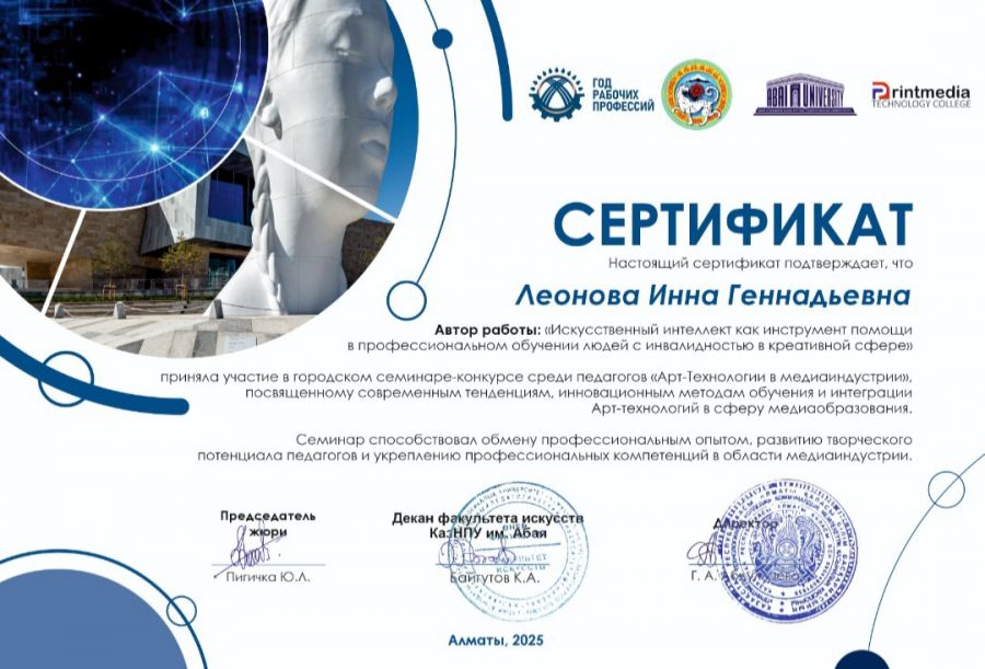 Поздравляем наших коллег: Леонову Инну Геннадьевну, мастера производственного обучения, Кулакову Юлию Михайловну, педагога-психолога, Селедкову Галину Валентиновну, мастера производственного обучения, ставших победителями Международного фестиваля полиграфического мастерства и инноваций «SmartPrint Фест»! Фестиваль проходил в Алматы и был организован КГКП "Колледж Принтмедиа технологий" совместно с КазНПУ имени Абая. Его цель заключалась в создании образовательного пространства для развития творчества, искусства, медиа- и полиграфических технологий, цифровой среды, обмена опытом, повышения квалификации преподавателей и популяризацию рабочих профессий среди молодёжи. Наши педагоги получили заслуженные награды: Диплом Гран-при за проект «Искусственный интеллект как инструмент помощи в профессиональном обучении людей с инвалидностью в креативной сфере», а также Диплом Первой степени за проект «Искусственный интеллект и сказочные сюжеты сквозь призму особого восприятия мира». Эти достижения подчеркивают высокий уровень профессионализма и творческий потенциал нашей команды Мы гордимся успехами наших коллег и желаем дальнейших творческих свершений и профессиональных достижений!