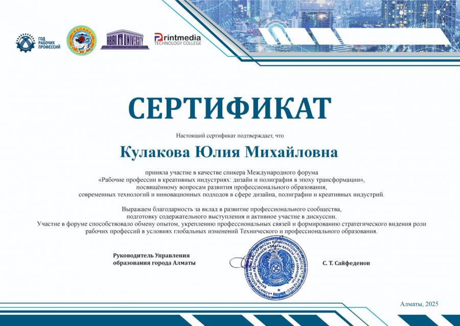 18 ноября 2025 года в г.Алматы прошел Международный форум «Рабочие профессии в креативных индустриях: дизайн и полиграфия в эпоху трансформации», организованного КГКП «Колледж Принтмедиа технологий» и Кафедрой Дизайна Факультета Искусств Казахского Национального университета имени Абая, обсуждались важные тренды и вызовы в креативной сфере. Цель форума — создание открытой профессиональной платформы и повышение мотивации студентов к освоению рабочих профессий. Леонова Инна Геннадьевна, мастер производственного обучения в Полиграфической мастерской в ЦСАиПП, представила презентацию «Искусственный интеллект и сказочные сюжеты сквозь призму особого восприятия мира», и поделилась опытом, как обучающиеся с помощью нейросетей учатся писать свои сказки, генерировать иллюстрации и создавать дизайн книг, развивая фантазию и дизайн-навыки. Форум подтвердил важность интеграции современных технологий и творческого подхода в профессиональное образование. Использование искусственного интеллекта не только расширяет возможности обучения, но и способствует развитию творческих, креативных навыков и социализации обучающихся в сфере дизайна и полиграфии.